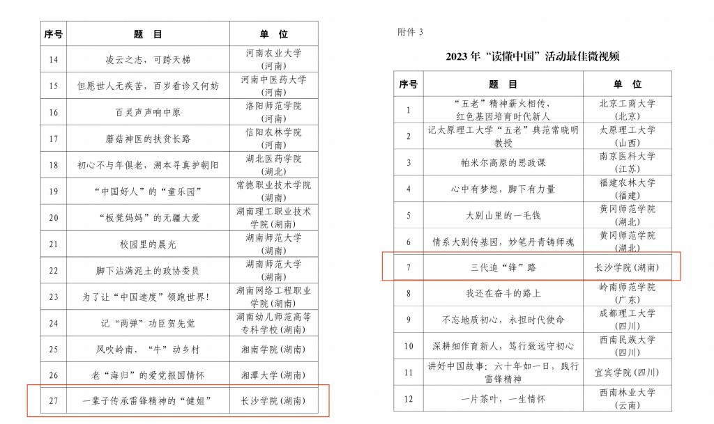 日前,教育部关工委下发《关于公布2023年“读懂中国”活动入选作品名单的通知》(教关委函〔2023〕11号),我校生物与化学工程学院杨嘉同学的作品《一辈子传承雷锋精神的“健姐”》获评2023年“读懂中国”活动最佳征文;马栏山新媒体学院丁子豪、姚振杰、龚家豪、邝佳斌、张茸皓同学的作品《三代追“锋”路》获评2023年“读懂中国”活动最佳微视频;学校连续五年获评“优秀组织奖”。
